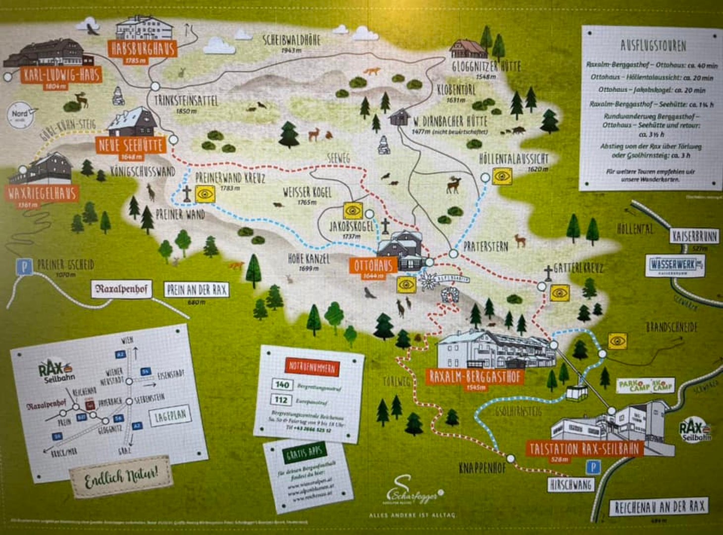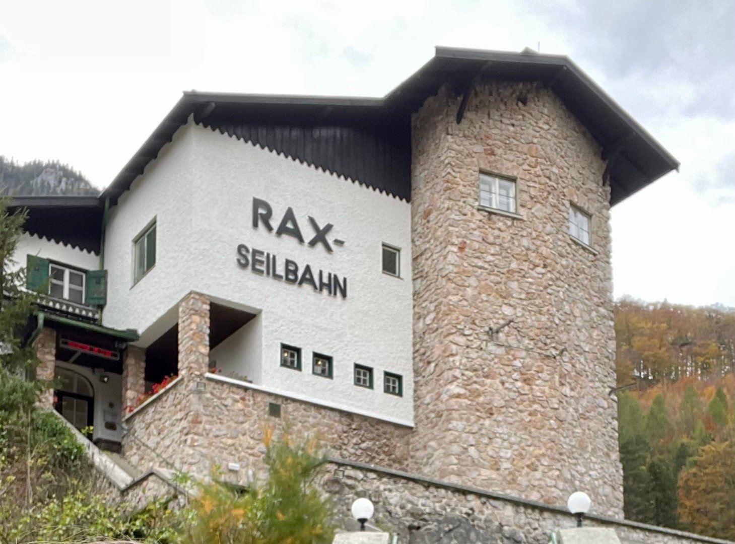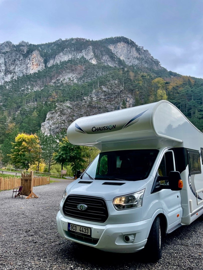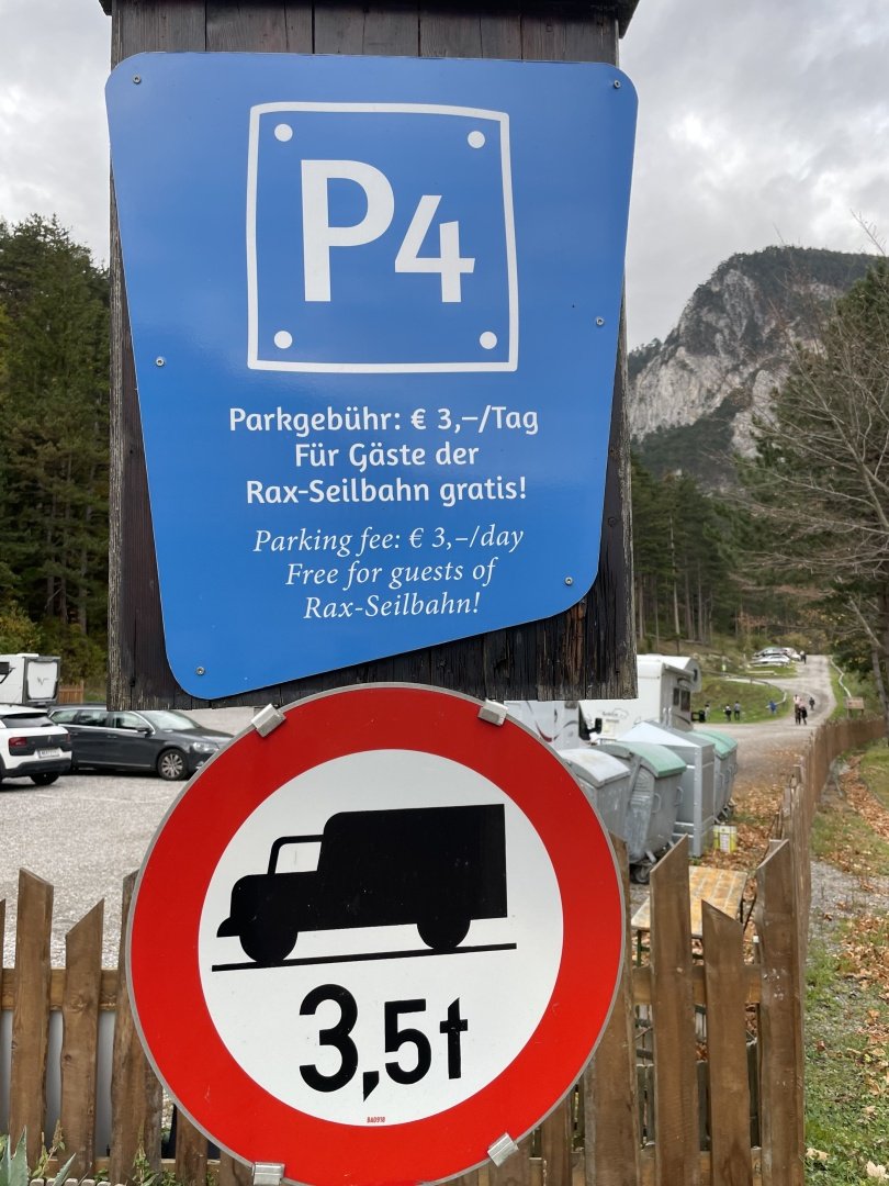 Cesta z Tlumačova do Hirschwang an der Rax je dlouhá asi 300 km a téměř celá po dálnici. Přímo pod nástupní stanicí kabinové lanovky Raxseilbahn je Park´n´Camp, lze zde platit kartou a je možné si parkovací místo předem zarezervovat. Zázemí je dostačující – k dispozici jsou el. přípojky, WC, sprchy, umývárna nádobí, výlevka pro chemické WC, venkovní posezení, jen jsme nenašli prostor pro vypuštění šedé vody. V letních měsících je otevřený malý bufet, koncem října ale již nebyl v provozu. V noci tu byl naprostý klid, i když je Park´n´Camp přímo u silnice. Hned za cestou protéká údolím říčka Schwarza s pěkným přístupem do vody, ta je v říjnu skutečně jen pro otužilé a pozor na bobry, které tu potkáte na každém kroku!