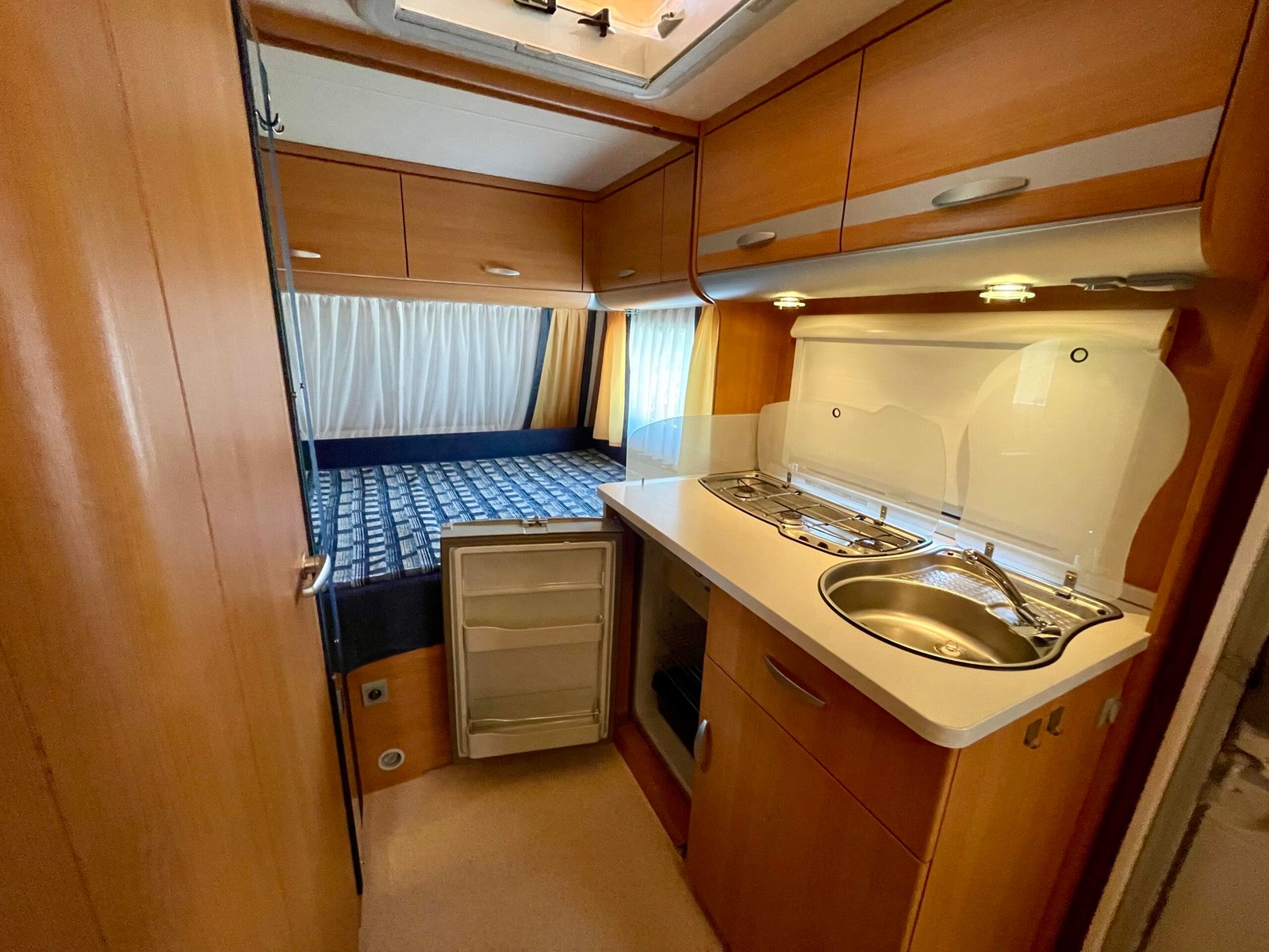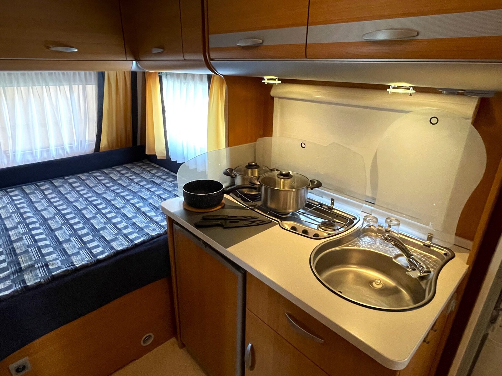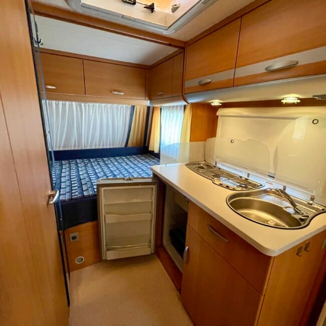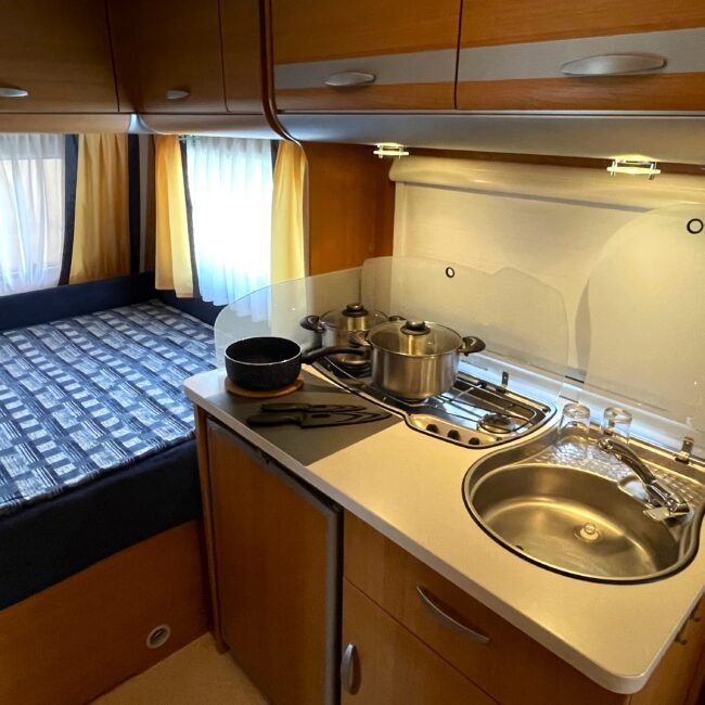 - Kuchyňka s dřezem, plynovým vařičem (3 plotýnky), lednicí s mrazákem (provoz na 230 V / 12 V / plyn), plně vybavená (talíře, příbory, sklenice, hrnky, hrnce, pánvice a mnoho dalších drobností), mycí prostředky